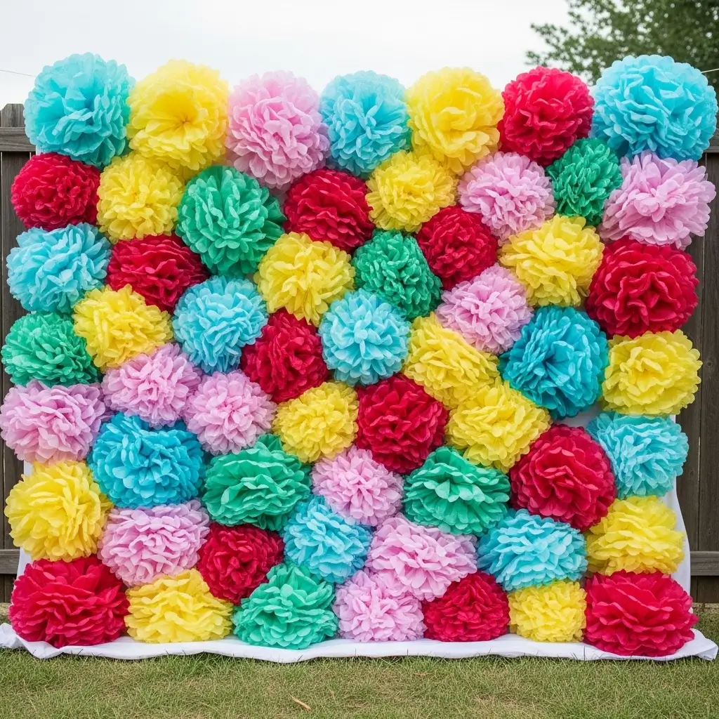 Craft a fantastically vibrant and cheerful setting by completely covering an outdoor fence or hanging sheet with large tissue paper pom-poms.