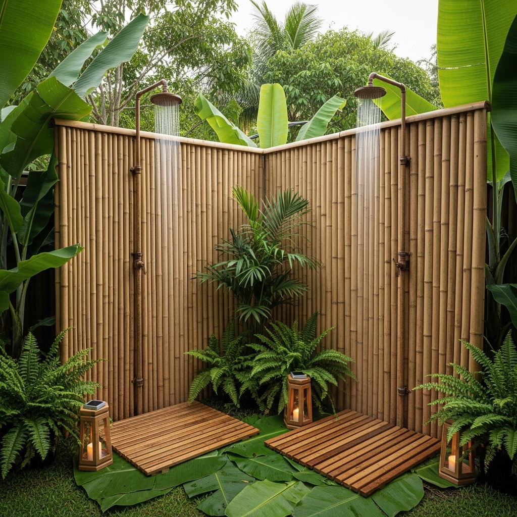 Bamboo barriers evoke island paradises, using sustainable Vietnamese Tam Vong poles for privacy without blocking breezes. Pair with lush ferns, palms, and a rain showerhead for resort vibes Pinterest boards overflow with these setups surrounded by banana leaves.