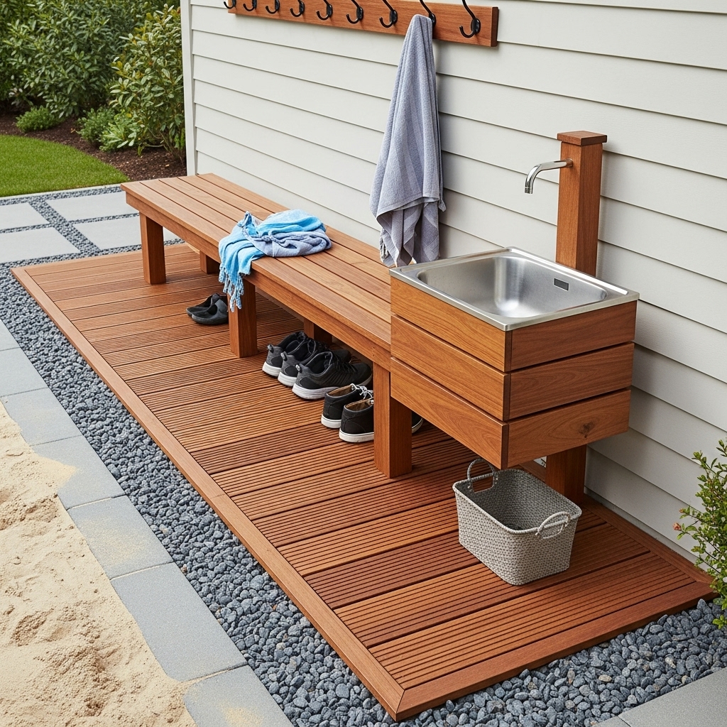 Add sturdy hooks, a simple bench, and suddenly towels, shoes, and swim gear have a home. Placed near pools, they handle sandy feet with ease, while gravel borders popular in Houzz deck designs keep drainage effortless and mess firmly under control.