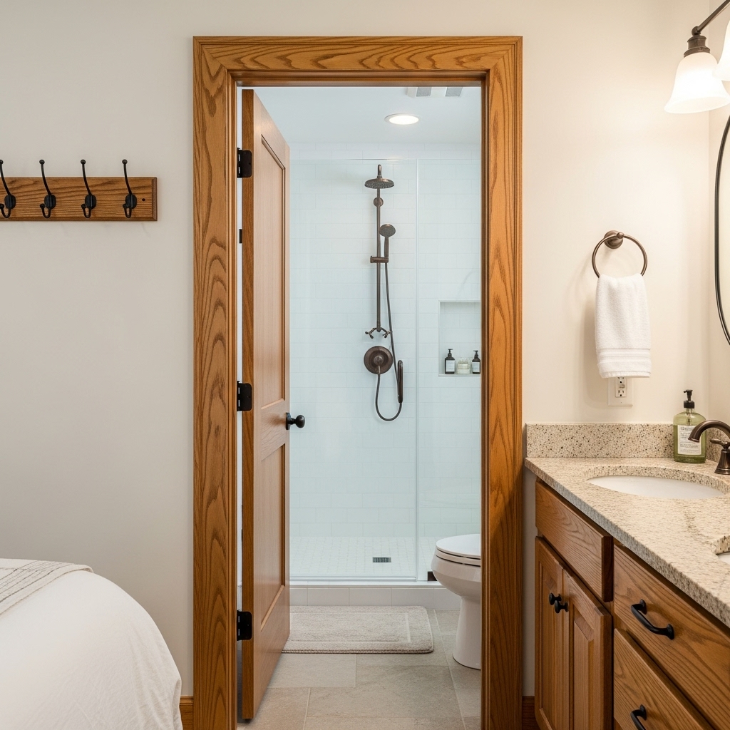 Thoughtful details matter: welded nail-head hooks keep order, while warm copper taps catch the light. It’s not just about aesthetics either. Zillow data consistently links this layout to higher resale value, making it a smart, stylish upgrade for modern primary suites. Privacy, flow, and comfort blend seamlessly into daily living spaces.