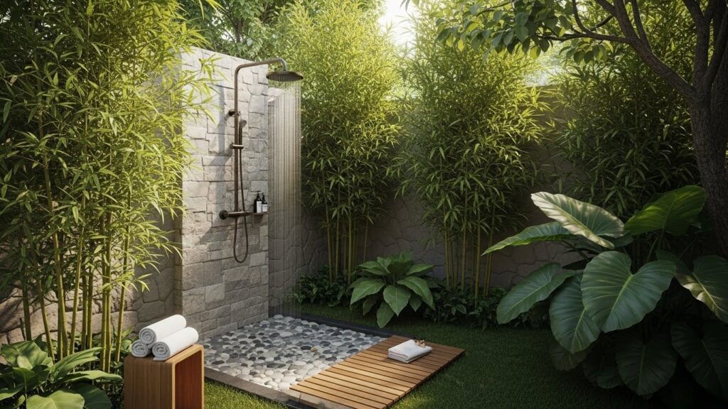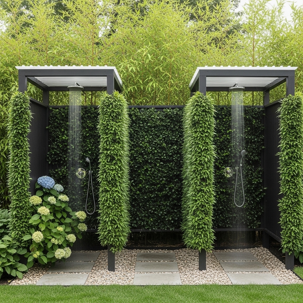 Greenery privacy screens turn outdoor showers into lush retreats. Tall bamboo, hydrangeas, or dense shrubs rise into living walls, often more affordable than solid fencing, as designer Ed Hollander notes. Sunset Magazine favors moisture-loving plants placed near open stalls to thrive naturally.