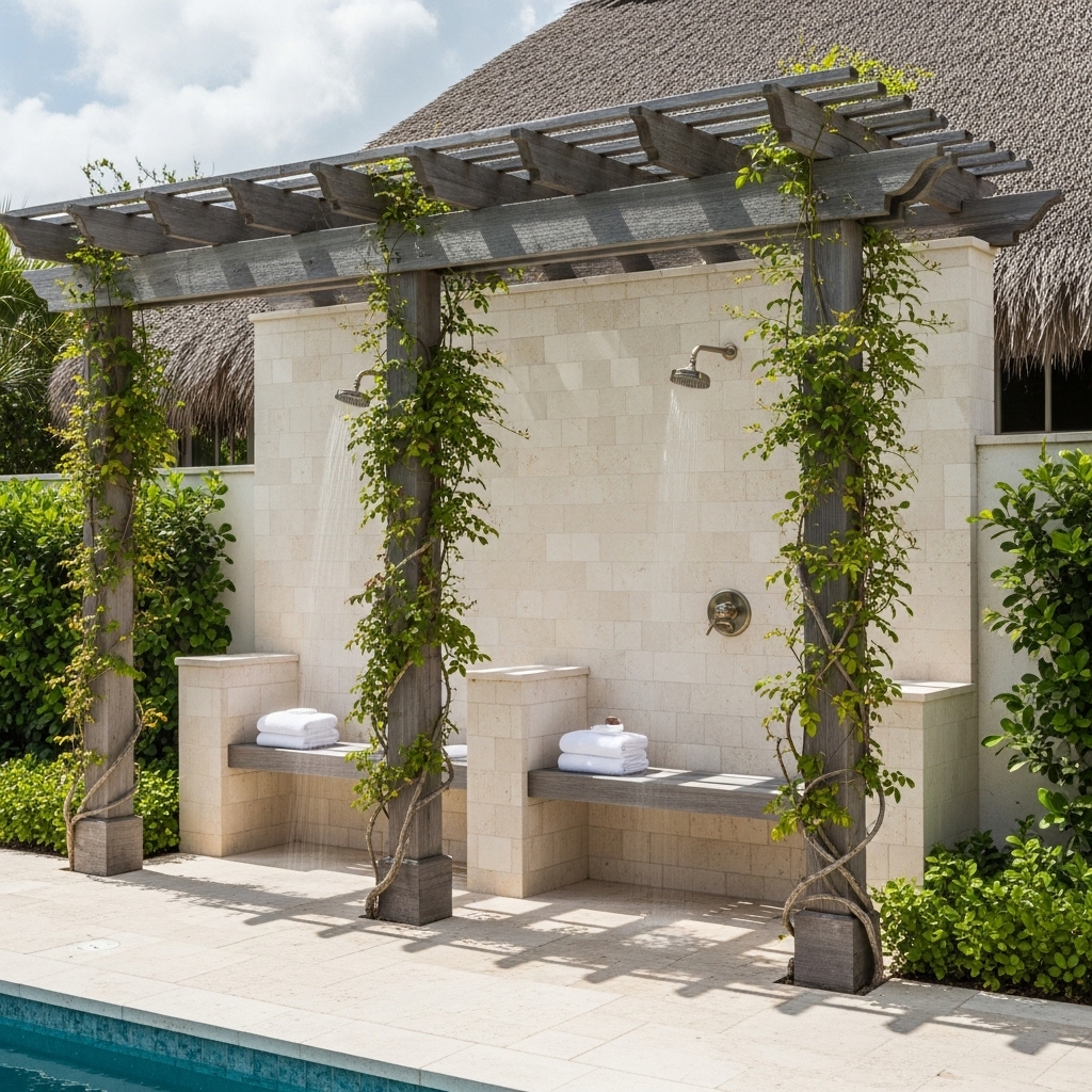 Pergola-covered showers feel relaxed yet refined. Topped with tabby tiles, they shield you from sun and rain while still letting breezes drift through, much like Florida retreats designed by Moor, Baker & Associates.