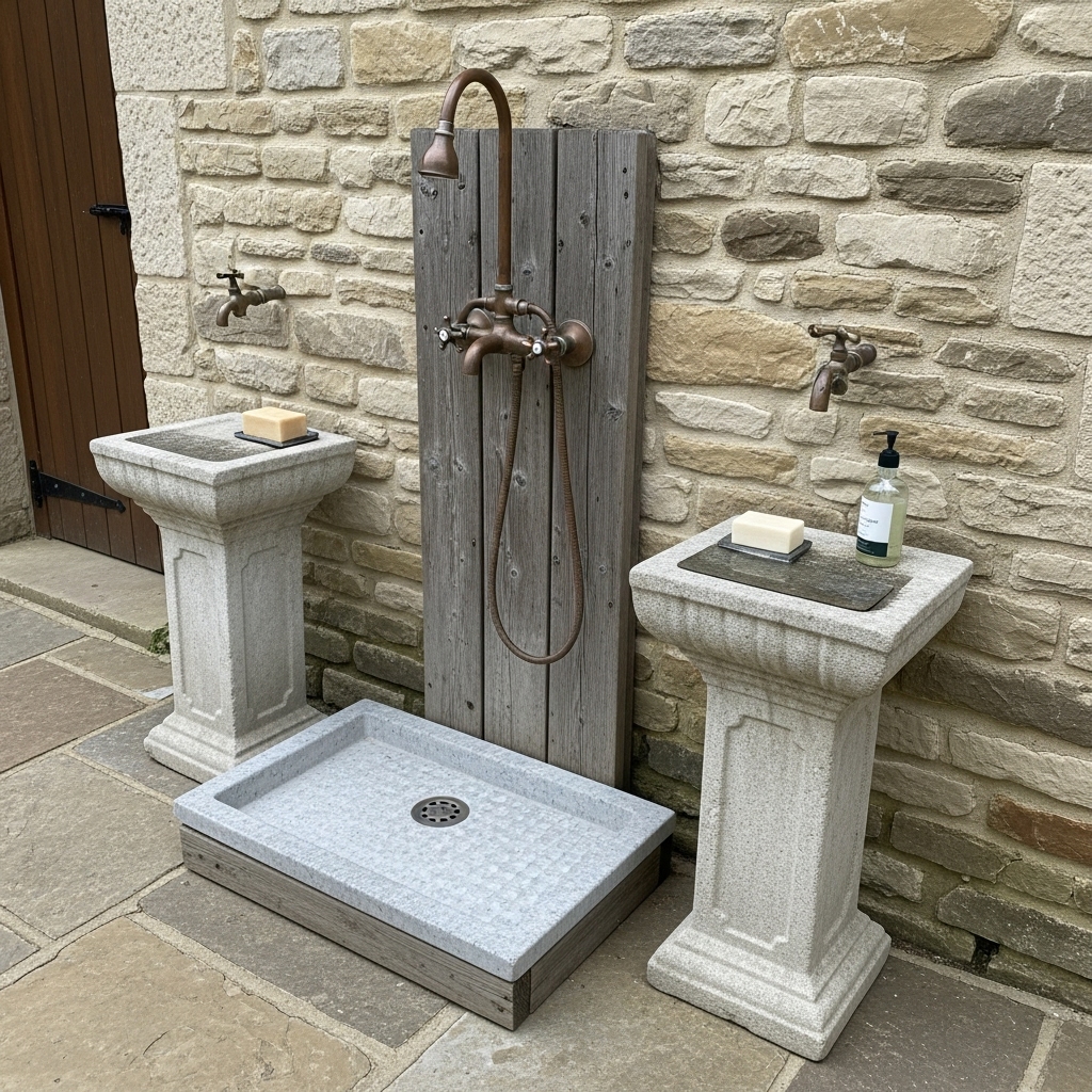 Stone pedestals neatly hold soaps, while simple foot washes add everyday practicality. The overall look feels honest, weathered, and welcoming, blending effortlessly with farmhouse settings without trying too hard. It works beautifully across rural homes, courtyards, and outdoor showers.