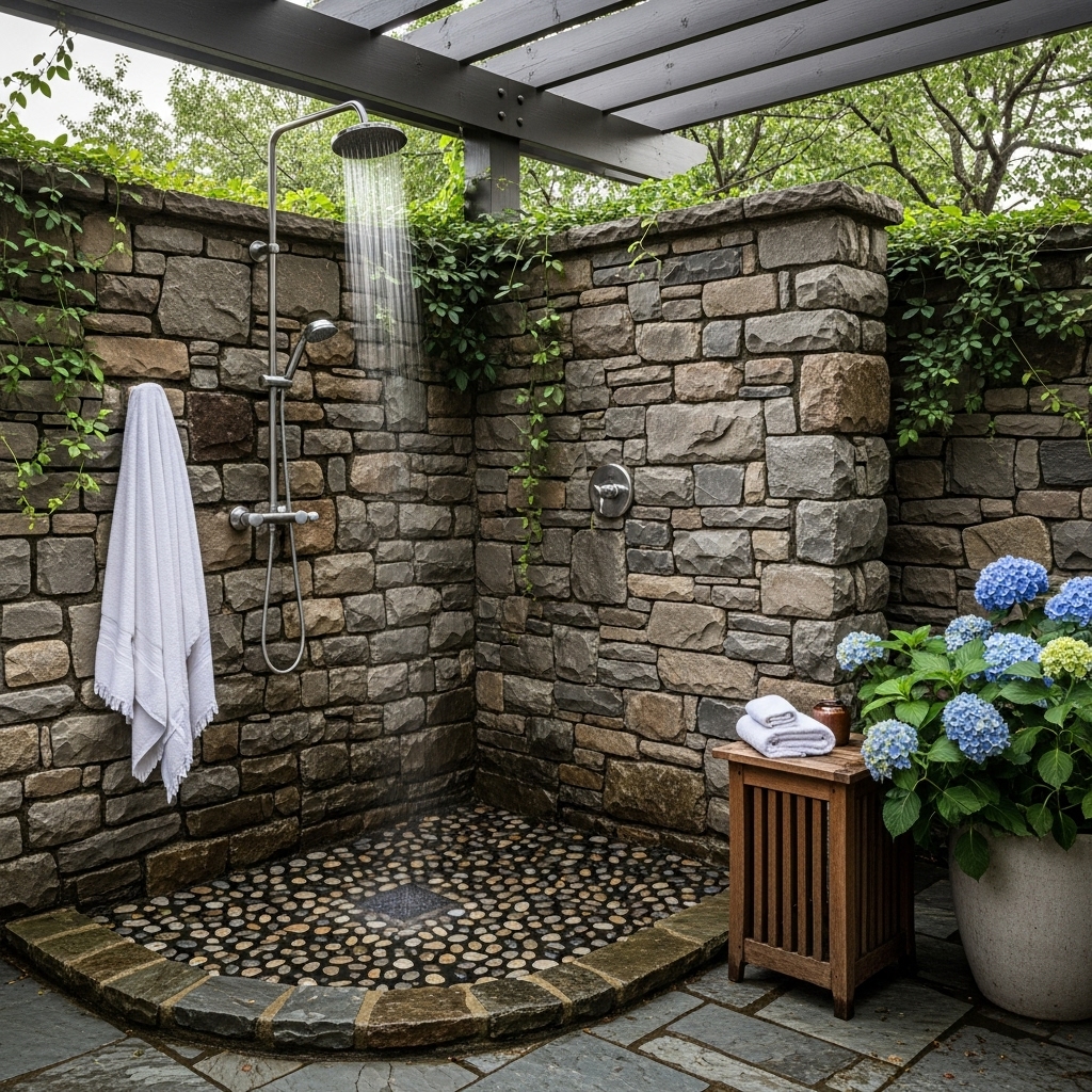 Natural stone enclosures bring outdoor showers to life with grounded, organic character. River rocks and slate flooring introduce spa-like texture while guiding water smoothly for natural drainage.