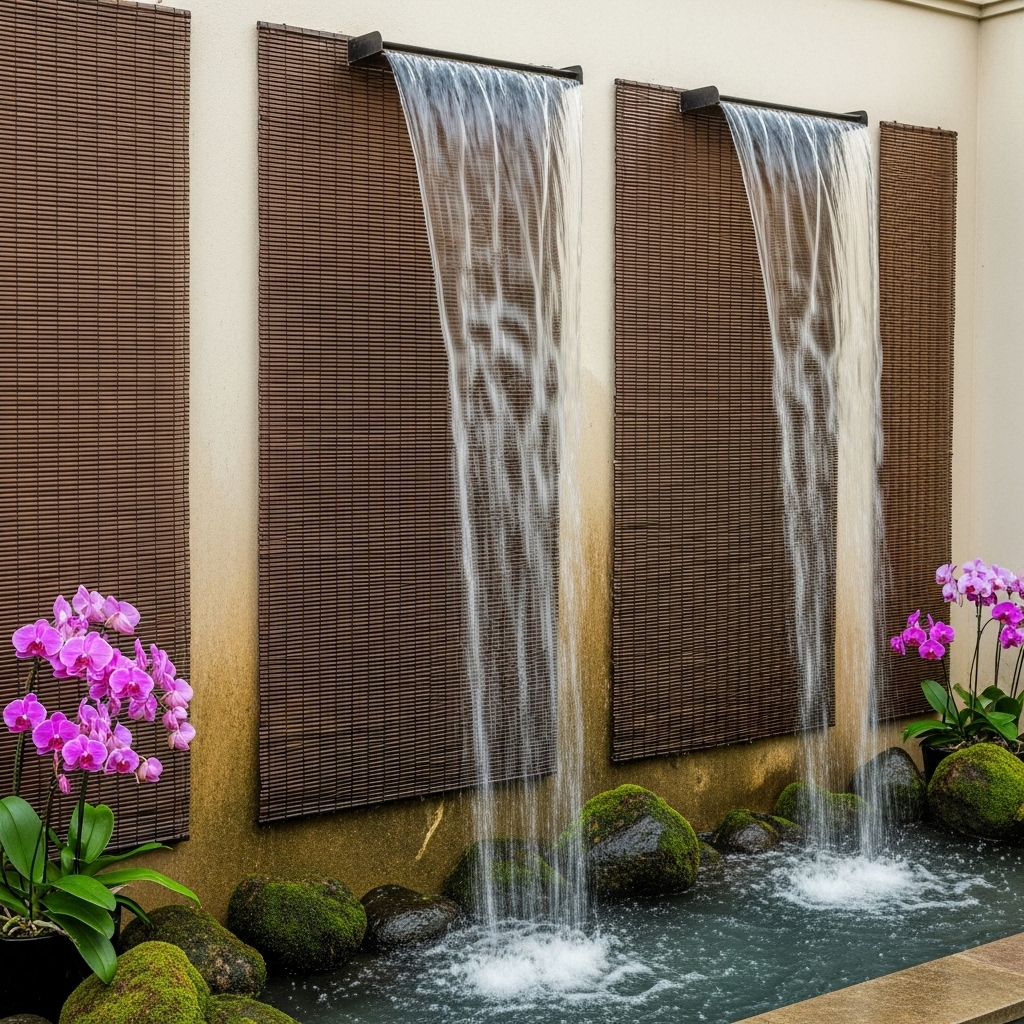 Mossy stones and lush orchids ground the scene in nature. Add solar-heated water for cooler days. No wonder Pinterest is flooded with these cascades, pure serenity designed to stop scrolling. Perfect for outdoor showers or garden walls craving movement, sound, and visual escape daily.