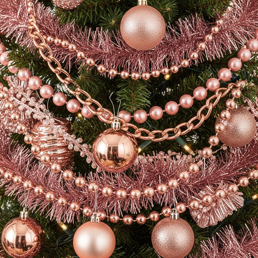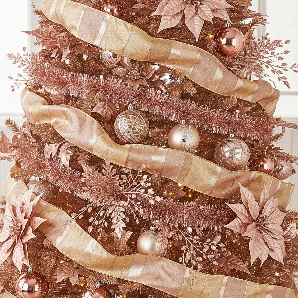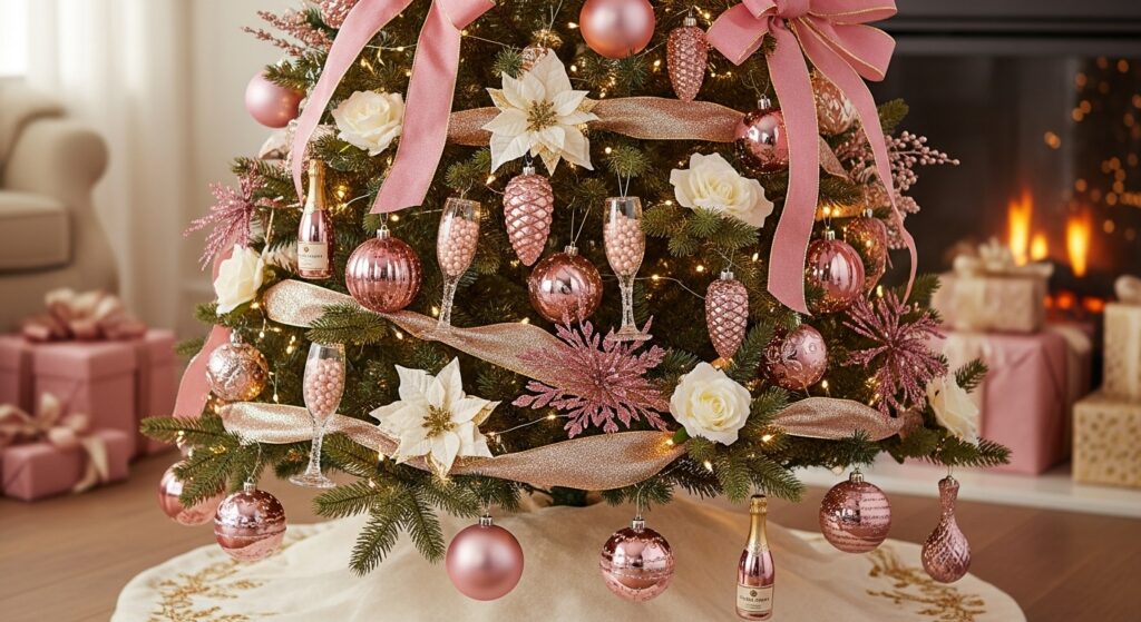 Nothing screams pink champagne like the shimmer of rose gold and a dash of gold. Metallic garlands, ribbons, or tinsel in these tones instantly elevate your tree. Wrap them around like you’re swirling champagne in a glass lush but not sloppy.