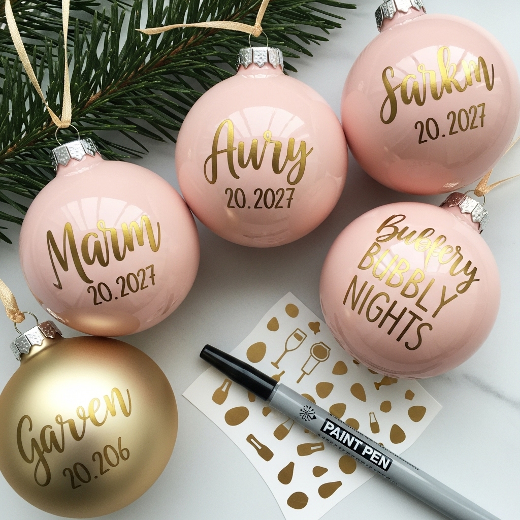 Custom ornaments spell personality. Choose blush or champagne base ornaments and personalize with gold lettering names, dates, or cheeky messages about bubbly nights.