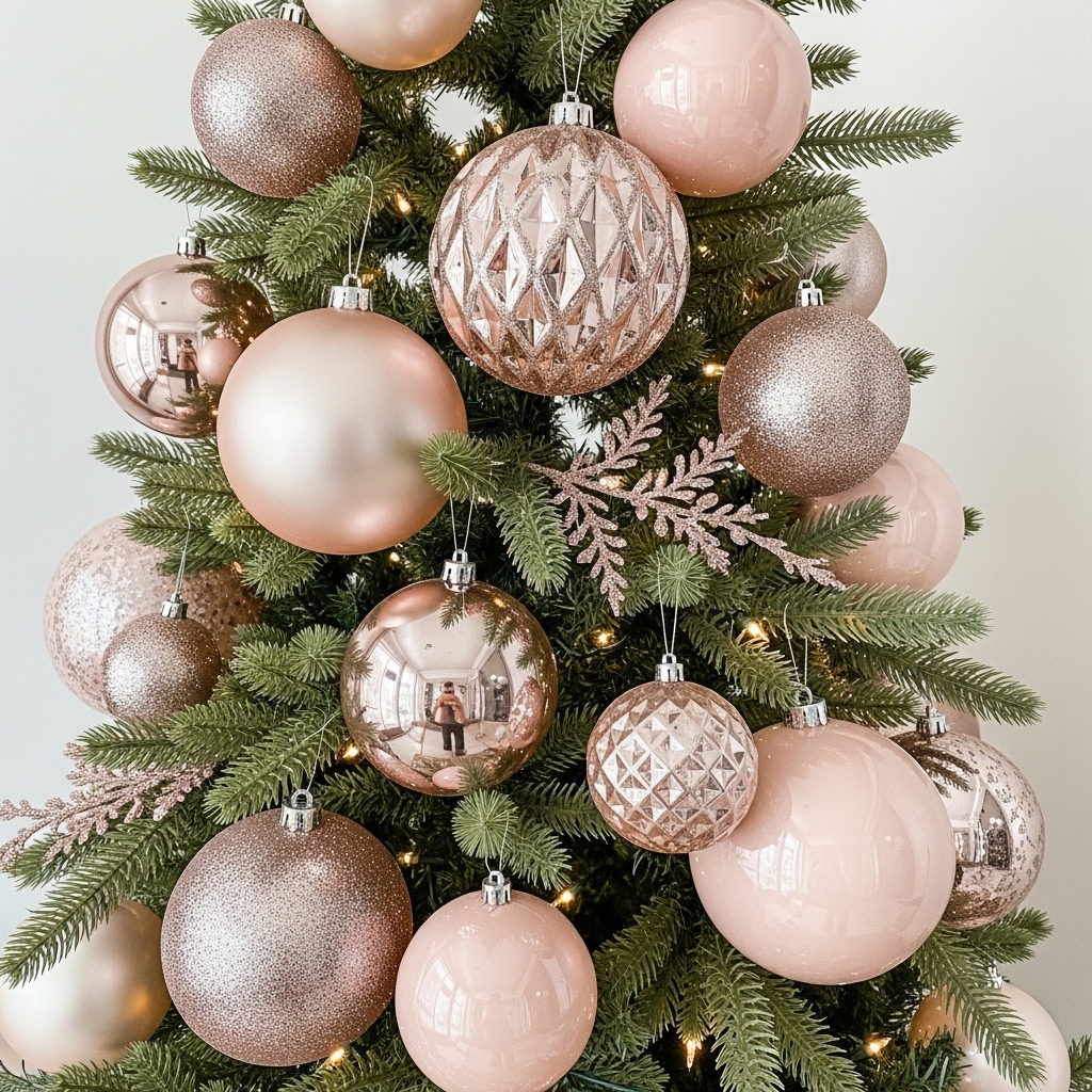 Start with the basics your ornaments. Oversized blush pink and champagne-colored baubles are the foundation of this look. Large ornaments add drama and depth; trust me, shy little bulbs won’t get the job done here. Look for matte, shiny, and glitter finishes mixed together. The combo hits the perfect balance between subtle glam and sparkle overload.