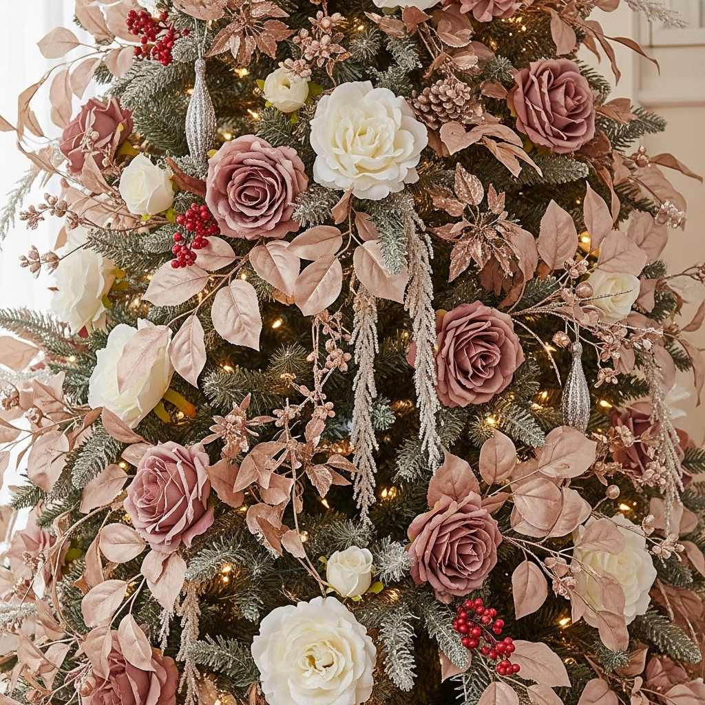 Last but definitely not least, soft florals and greenery make your tree look alive and lush. Think blush peonies, dusty roses, and ivory blooms with champagne-tinted leaves. This softens the sparkle and adds a romantic charm.