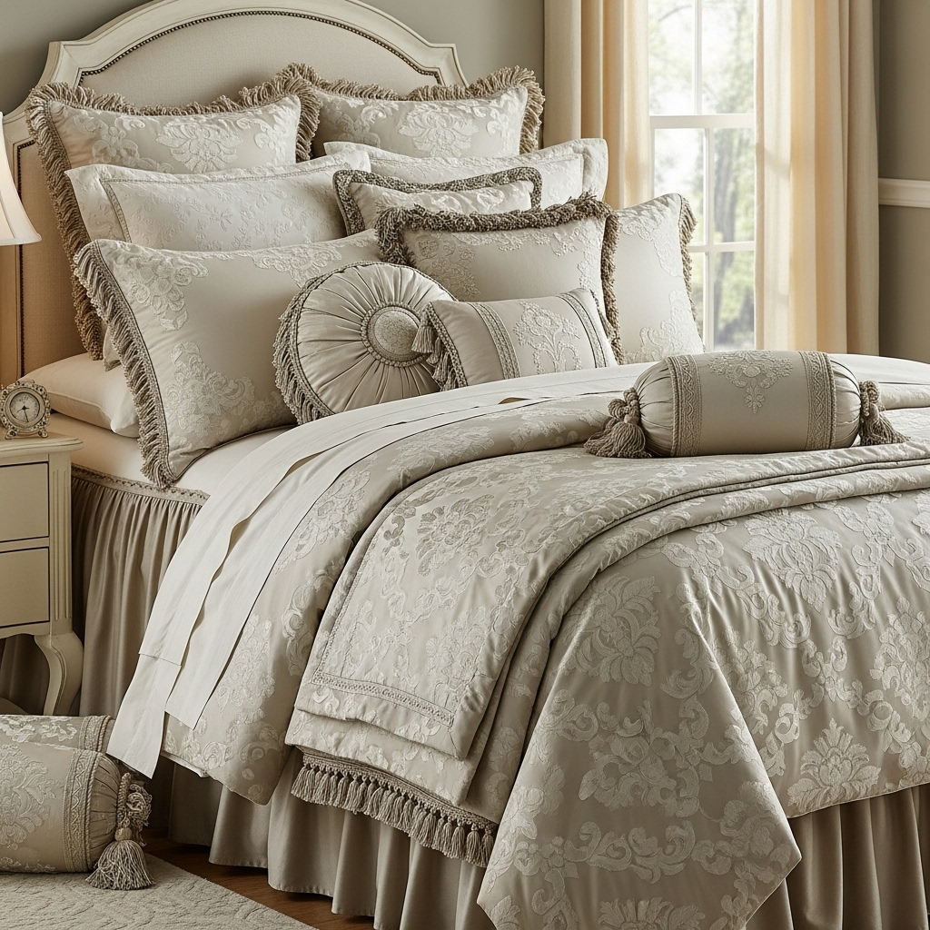 Utilize silks, satins, or high-quality damask weaves featuring subtle tone-on-tone floral or scroll patterns. Layering is key to the look.
