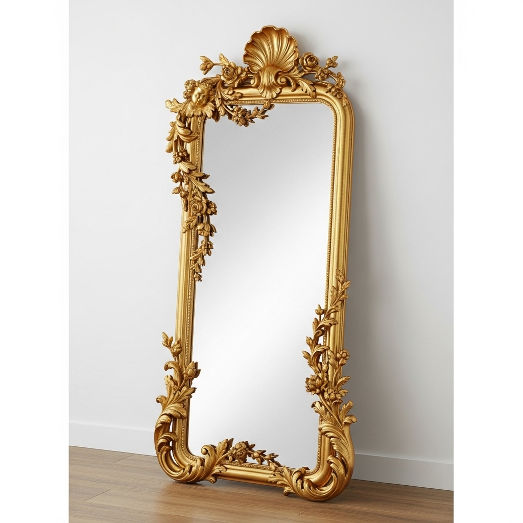 The carvings should feature motifs like scrolling acanthus leaves, blooming flowers, cherubs, or stylized seashells that seem to crawl organically up one side differently than the other. Leaning a large, ornate floor mirror against a wall can instantly dramatically expand the visual space of the room.