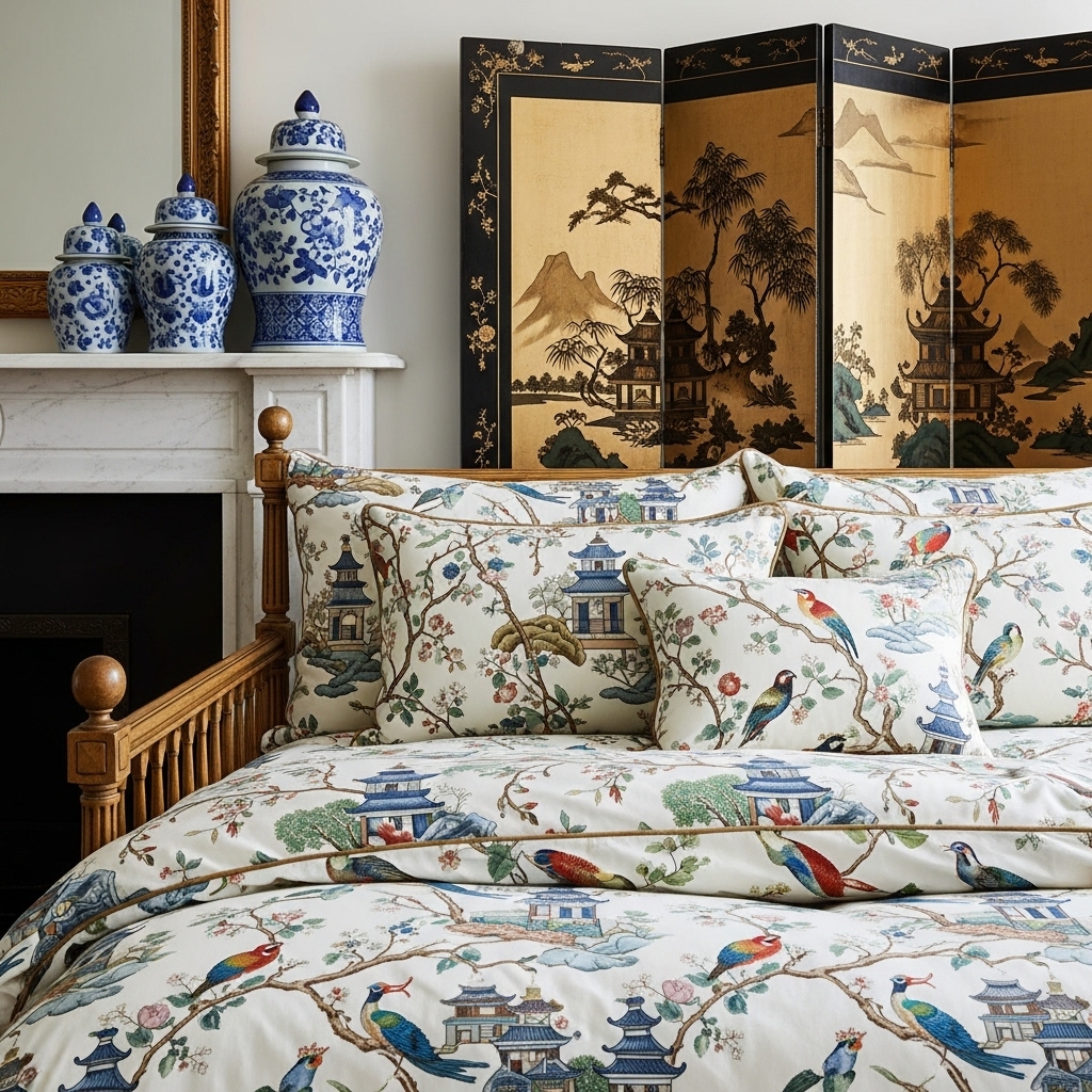 This might include blue and white porcelain ginger jars displayed on a mantelpiece, a lacquered folding screen with hand-painted landscapes used as a headboard alternative or room divider, or accent pillows featuring whimsical pagodas and exotic bird patterns. These elements add a layer of worldly sophistication and intricate pattern.