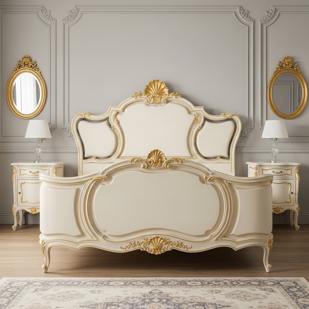 The bed must be the undisputed centerpiece of a Rococo Revival room. Look for bed frames characterized by distinctively curved lines rather than sharp angles, featuring high headboards with intricate botanical or shell carvings.