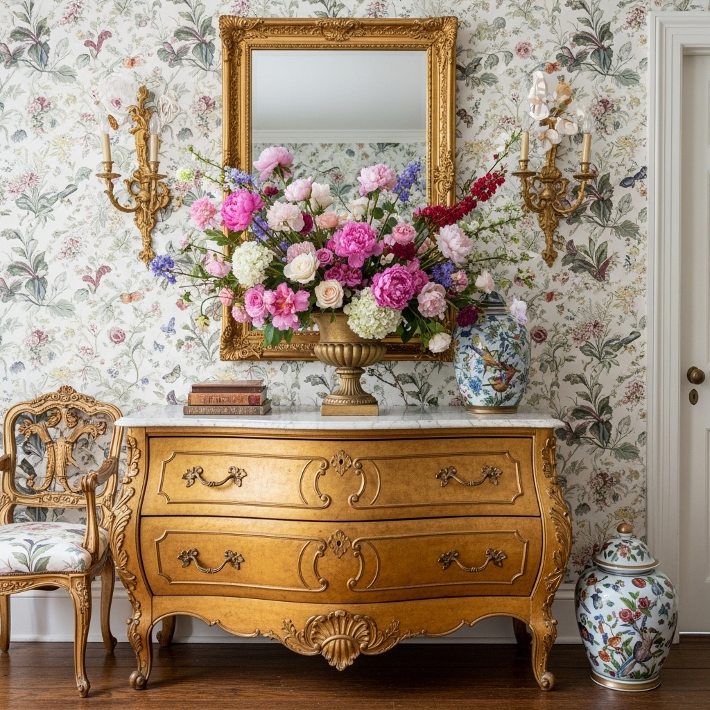 A large, asymmetrical floral arrangement featuring roses, peonies, and hydrangeas in a gilded urn placed on a dresser adds a fresh, organic element that perfectly complements the manufactured curves of the furniture.