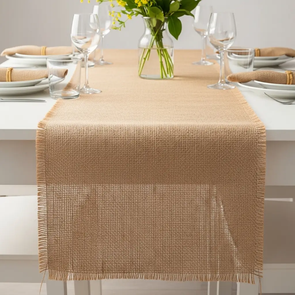 You can leave the edges slightly frayed for an intentionally relaxed and organic appearance. Burlap pairs exceptionally well with both elegant crystal glasses and casual ceramic plates, making it incredibly adaptable.