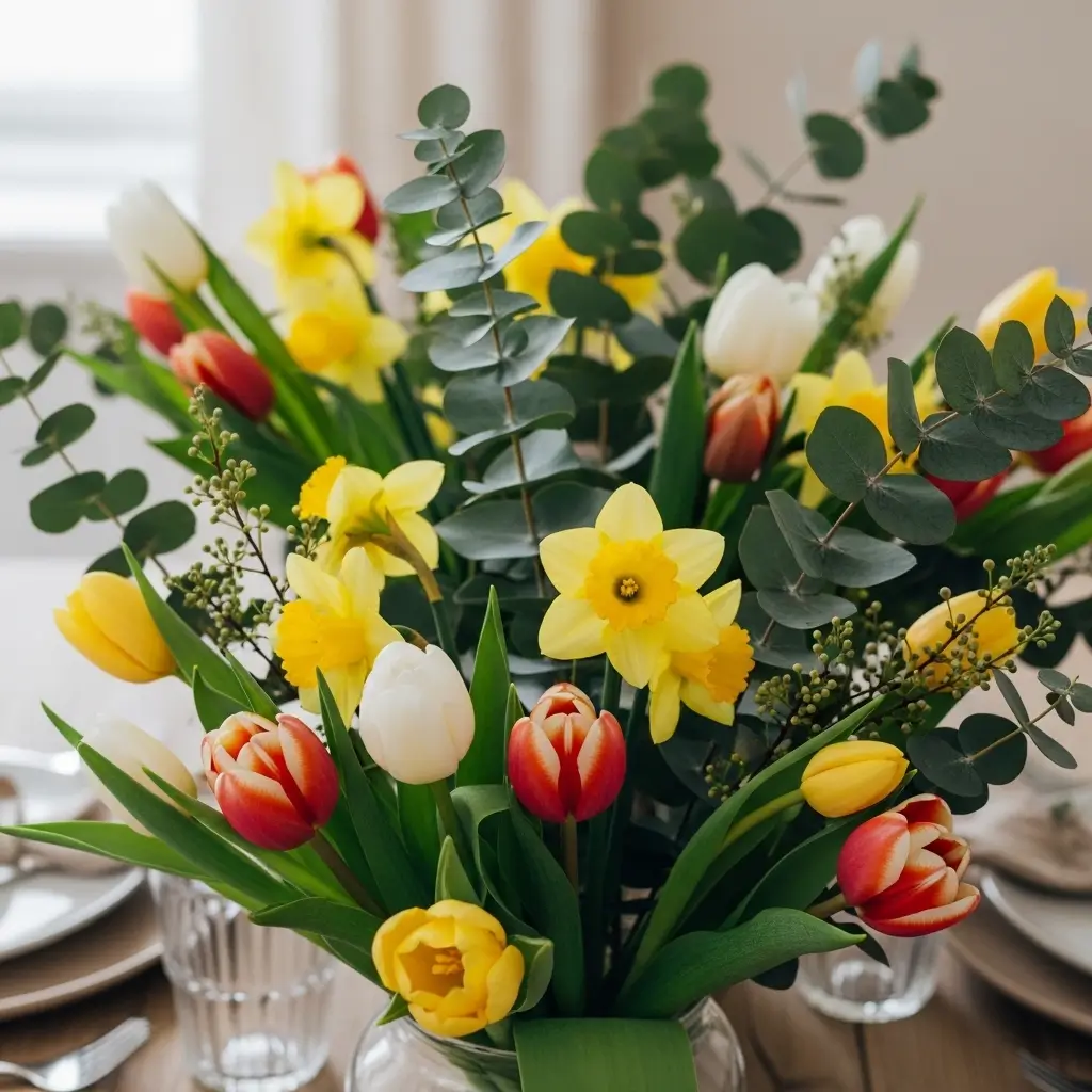 Opting for loosely arranged, wild-looking bouquets featuring colorful tulips, bright daffodils, and leafy eucalyptus branches creates an effortlessly stunning focal point.