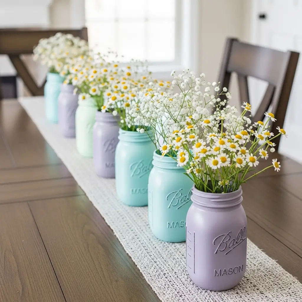 Arrange them in clusters down the middle of your dining area, filled with freshly picked daisies or lovely babyโ€™s breath. This budget-friendly decor choice radiates cheerful simplicity and brings joyful spring energy indoors.