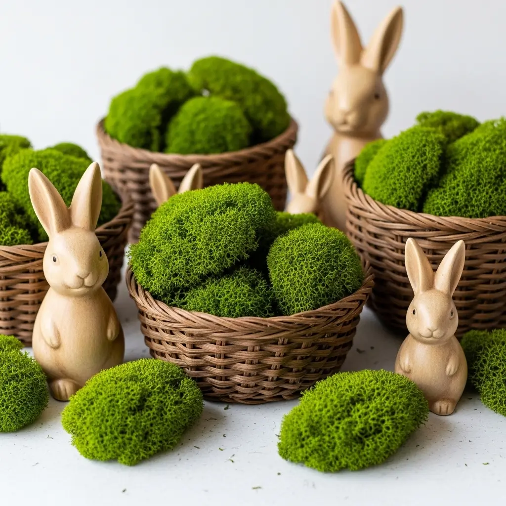 This unique botanical element introduces a rich, velvety texture that mimics a lush forest floor. Moss pairs spectacularly well with wooden accents and ceramic bunnies, helping to tie the entire woodland aesthetic together while keeping the vibe fresh, bright, and earthy.