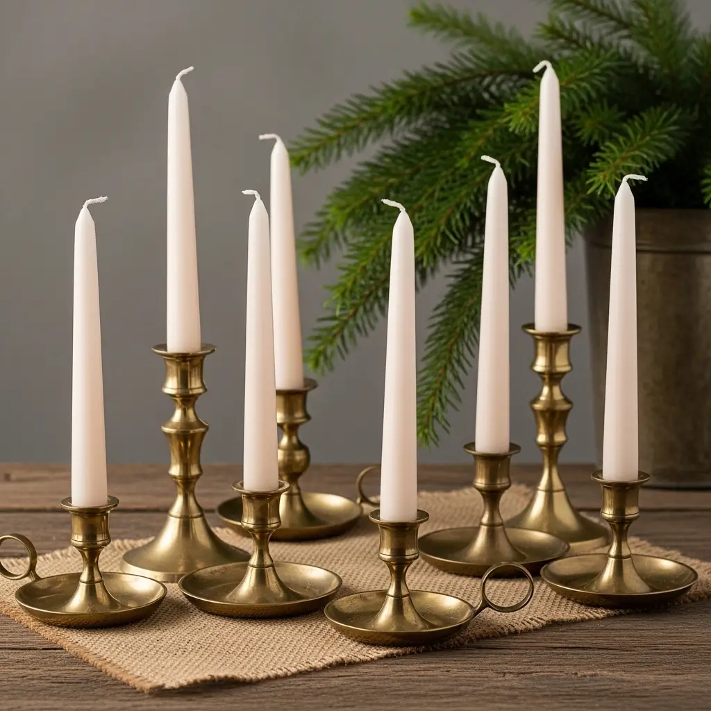 Incorporating vintage brass candlesticks into your design instantly adds a layer of timeless warmth and subtle metallic shine. The gracefully aged patina on these classic holders contrasts beautifully against rougher textures like burlap and wood.