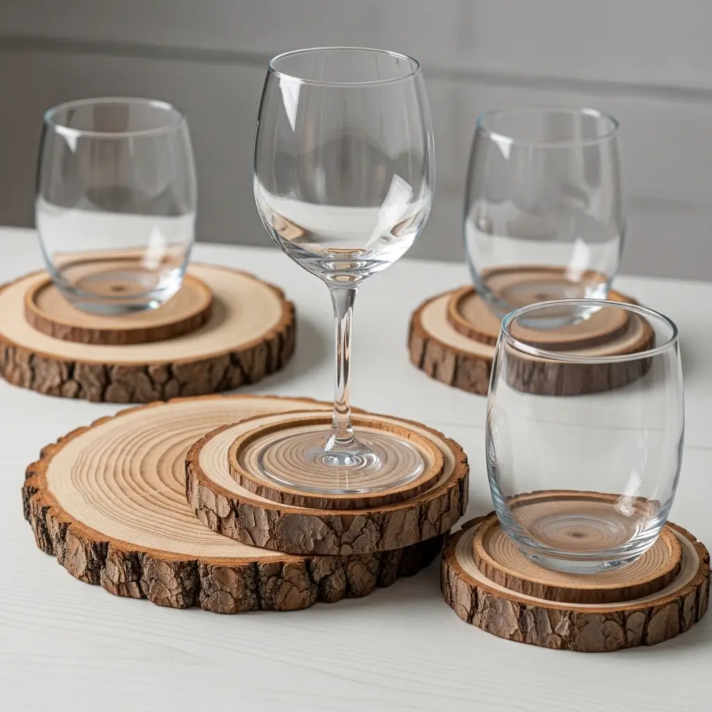 Using thick slices of natural tree branches as drink coasters is a creative and highly functional way to enhance your theme.
