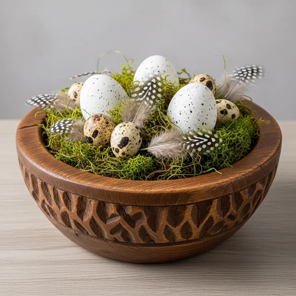 A hand-carved wooden dough bowl serves as an absolutely breathtaking centerpiece that naturally draws everyoneโ€™s attention. Filling this antique-style vessel with an assortment of faux speckled eggs, soft green moss, and delicate feathers creates a stunning visual display.