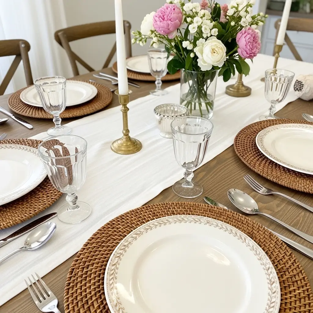 Incorporating woven rattan chargers into your setup introduces a natural, earthy texture to your spring celebration.