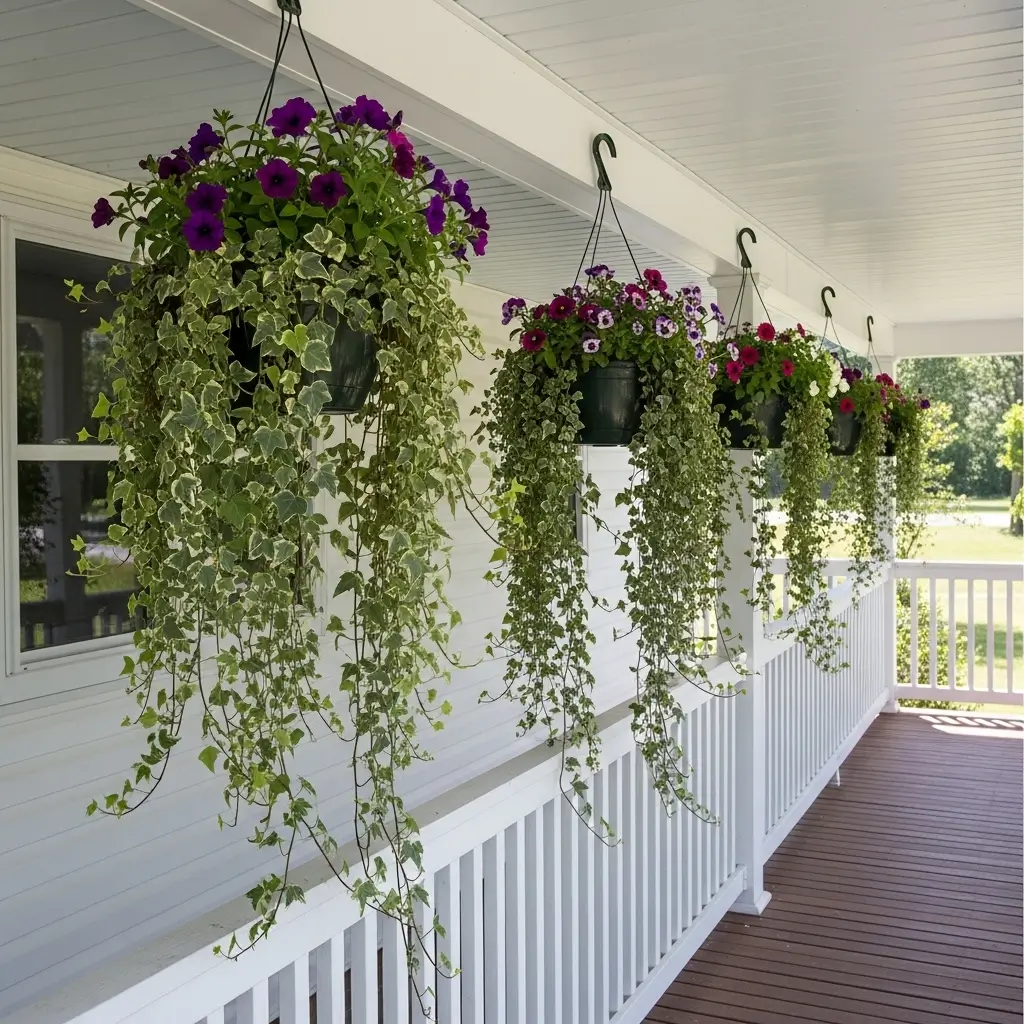 Maximize your limited square footage by drawing the eye upward with beautiful hanging flower baskets suspended from your porch ceiling.