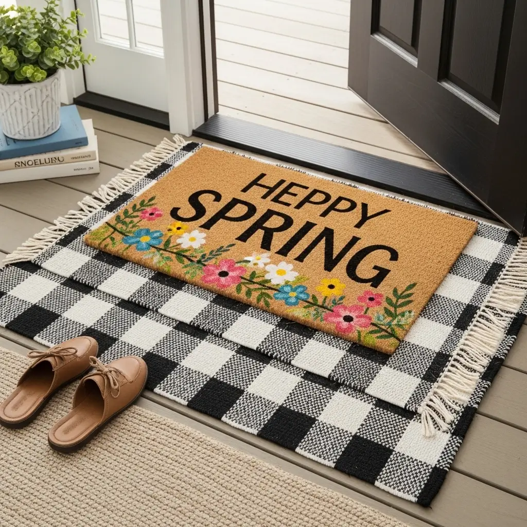 Top it with a standard-sized, durable coir mat featuring a cheerful spring greeting or a lovely floral motif. This simple combination adds incredible texture and dimension to even the tiniest porch space.