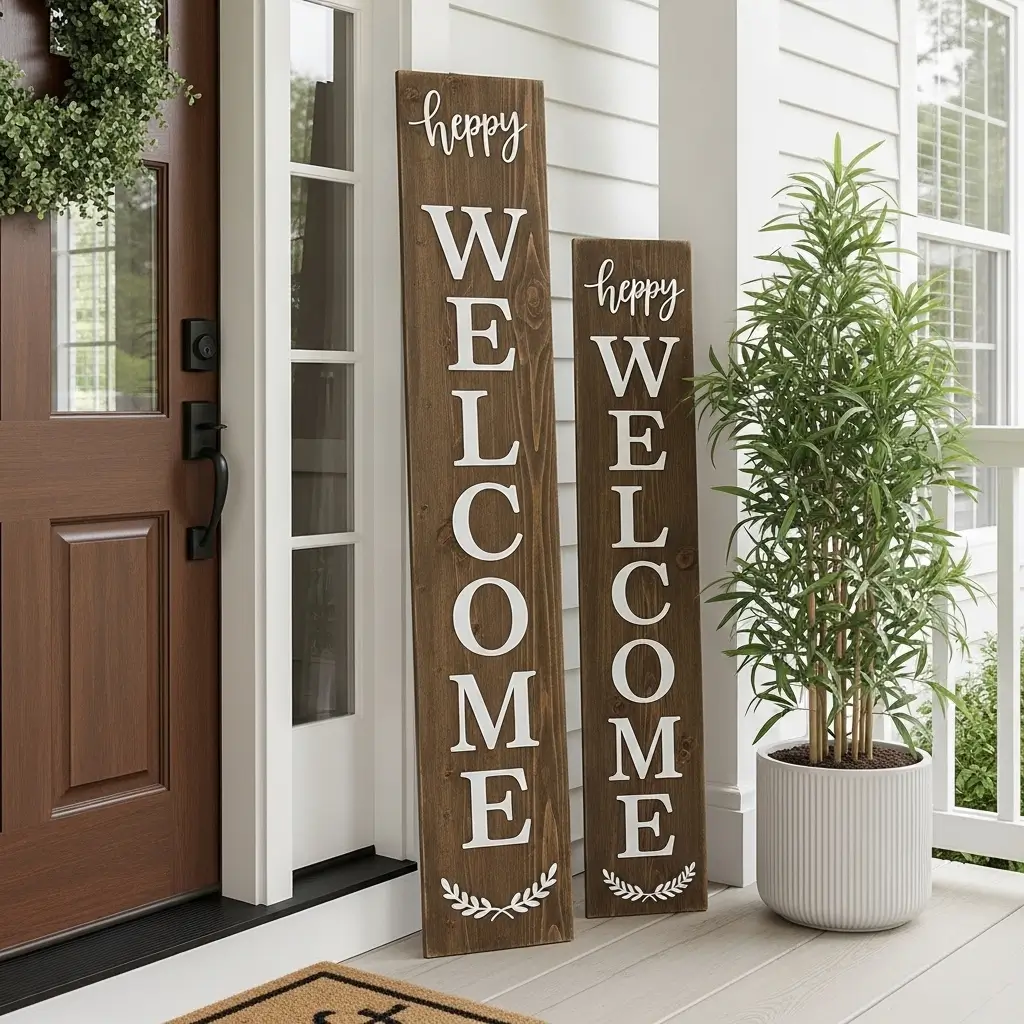 A tall, rustic vertical welcome sign is an exceptional decor choice for narrow porches because it utilizes vertical space brilliantly.