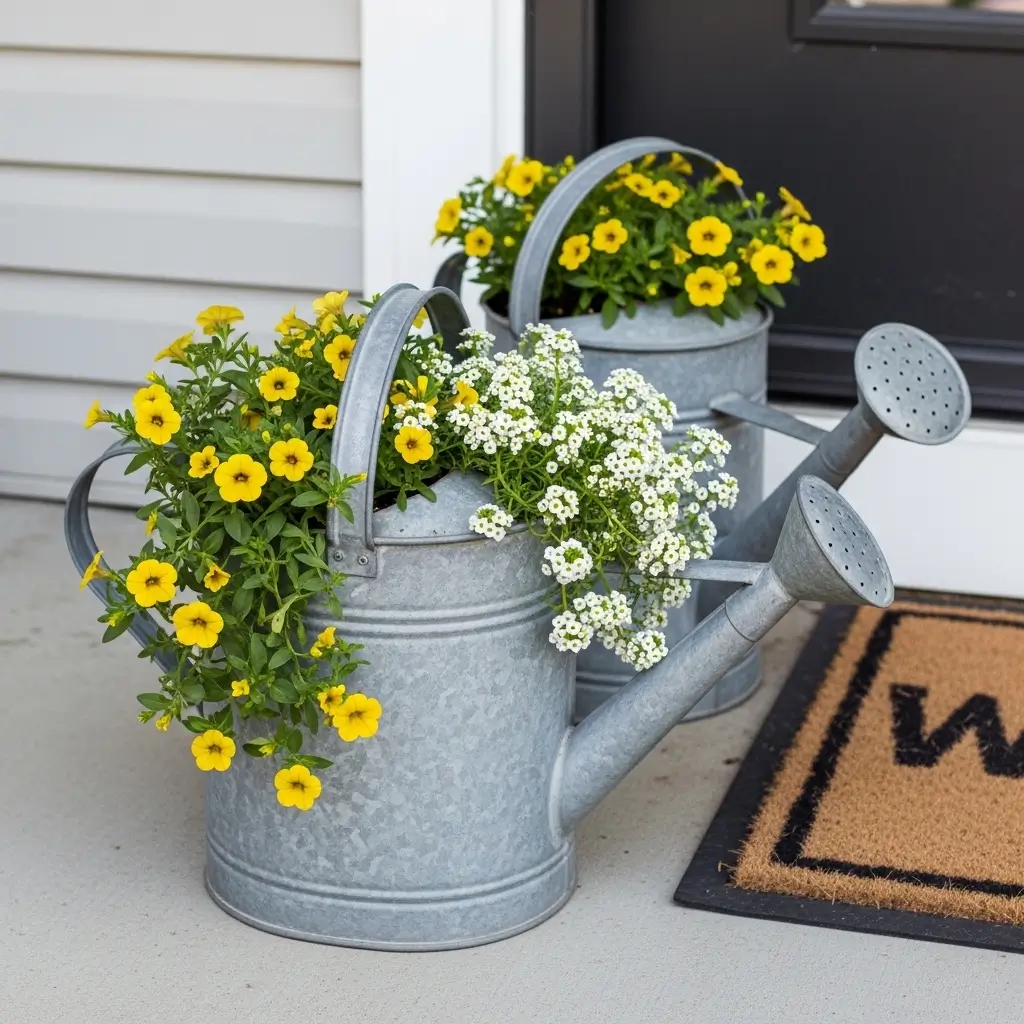 This creative upcycling idea perfectly captures the charming essence of springtime renewal. Simply fill the weathered metal can with rich potting soil and plant a cluster of bright, trailing flowers like cheerful yellow calibrachoa or delicate white alyssum.