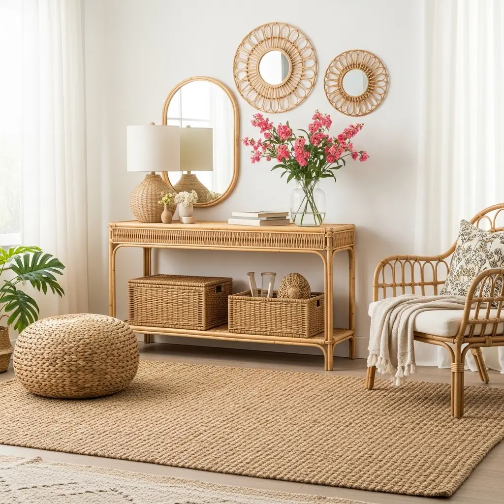 Add inexpensive wicker baskets for storage under consoles to hide clutter, or hang rattan wall decor for added textural interest.