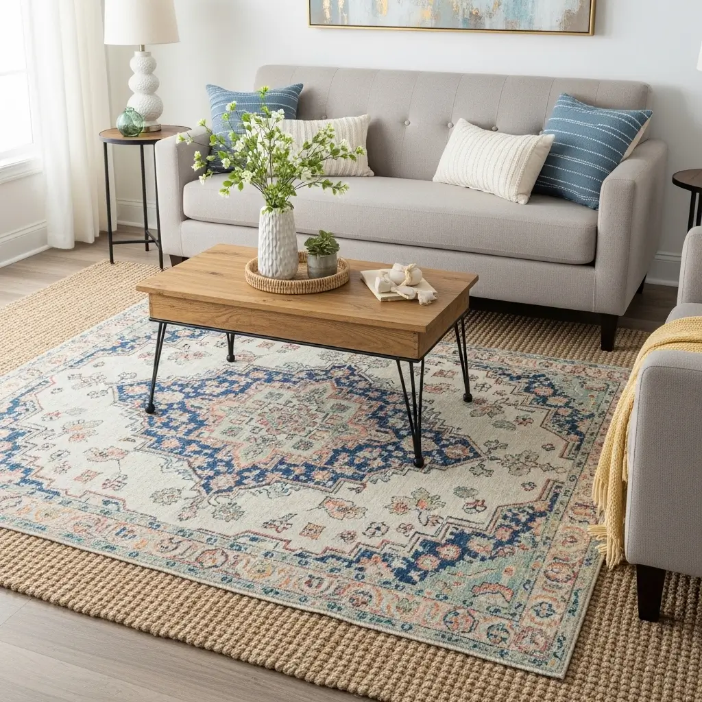 This adds a necessary pop of color and pattern exactly where you need it usually under the coffee table without the cost of a room-sized textile. It creates visual depth, defines the central seating area, and injects instant personality.