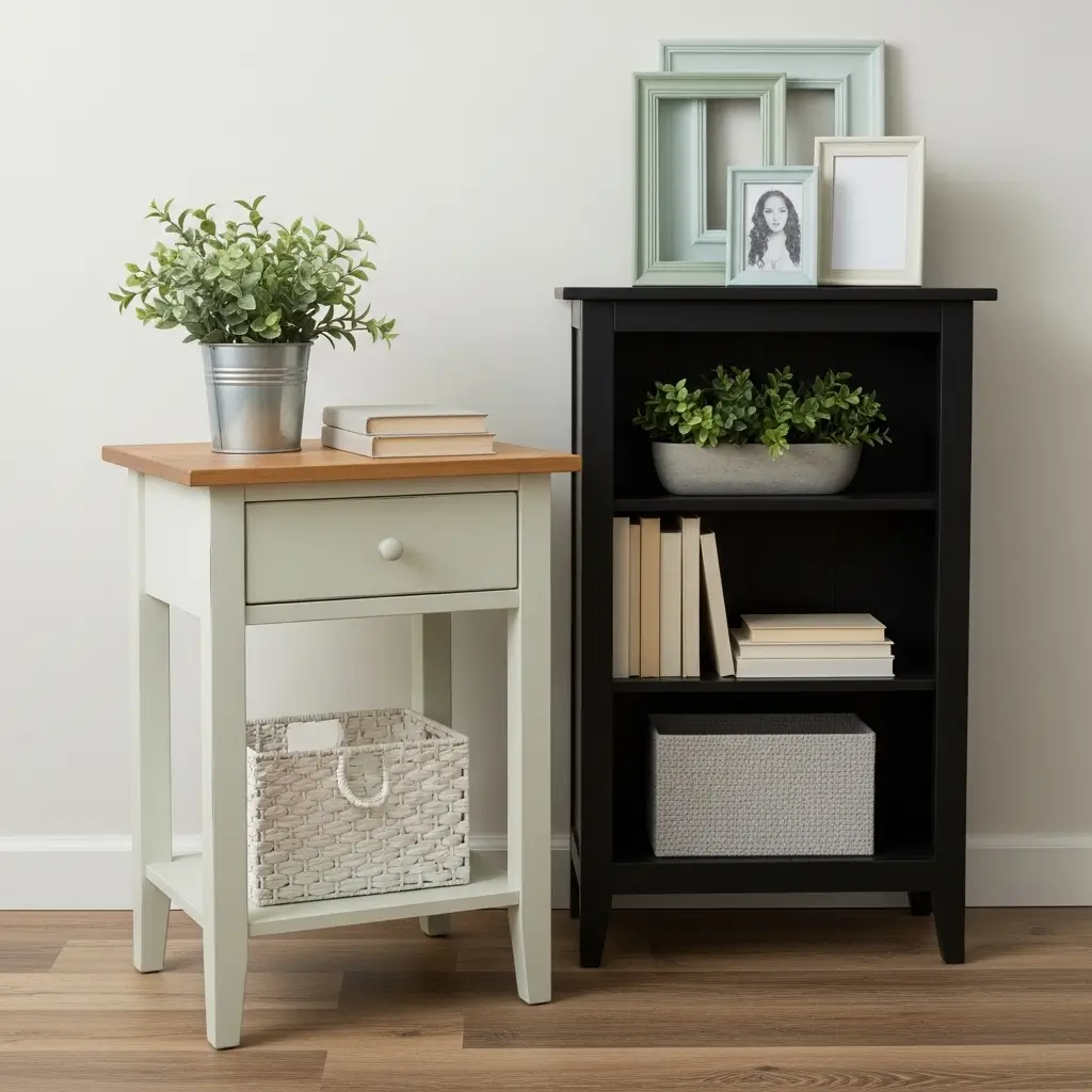 Replace them with a curated vignette featuring lighter elements: a stack of magazines with bright, inspiring covers, a small potted succulent, a ceramic bird figurine, or a brightly colored lacquer tray to corral remotes.