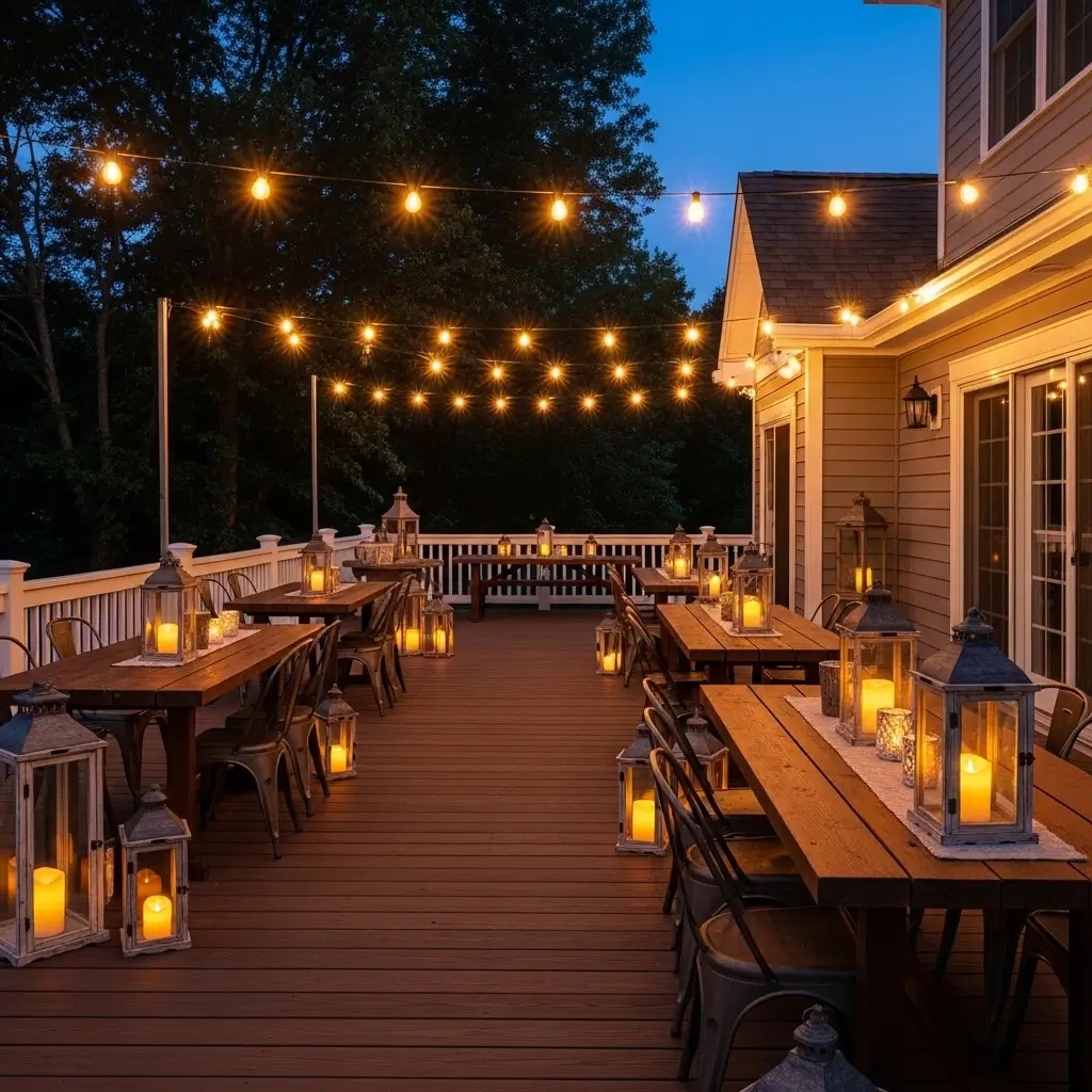 Complement these enchanting overhead lights by strategically placing rustic metal or distressed wooden lanterns around the deck’s perimeter and directly on tables.