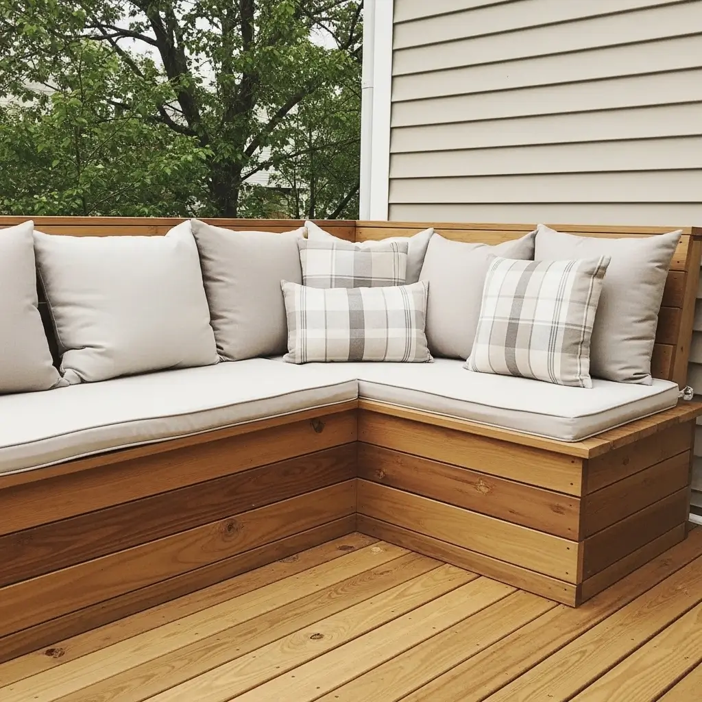 Maximize your entertaining potential by incorporating a cozy corner featuring built-in wooden benches into your deck design.