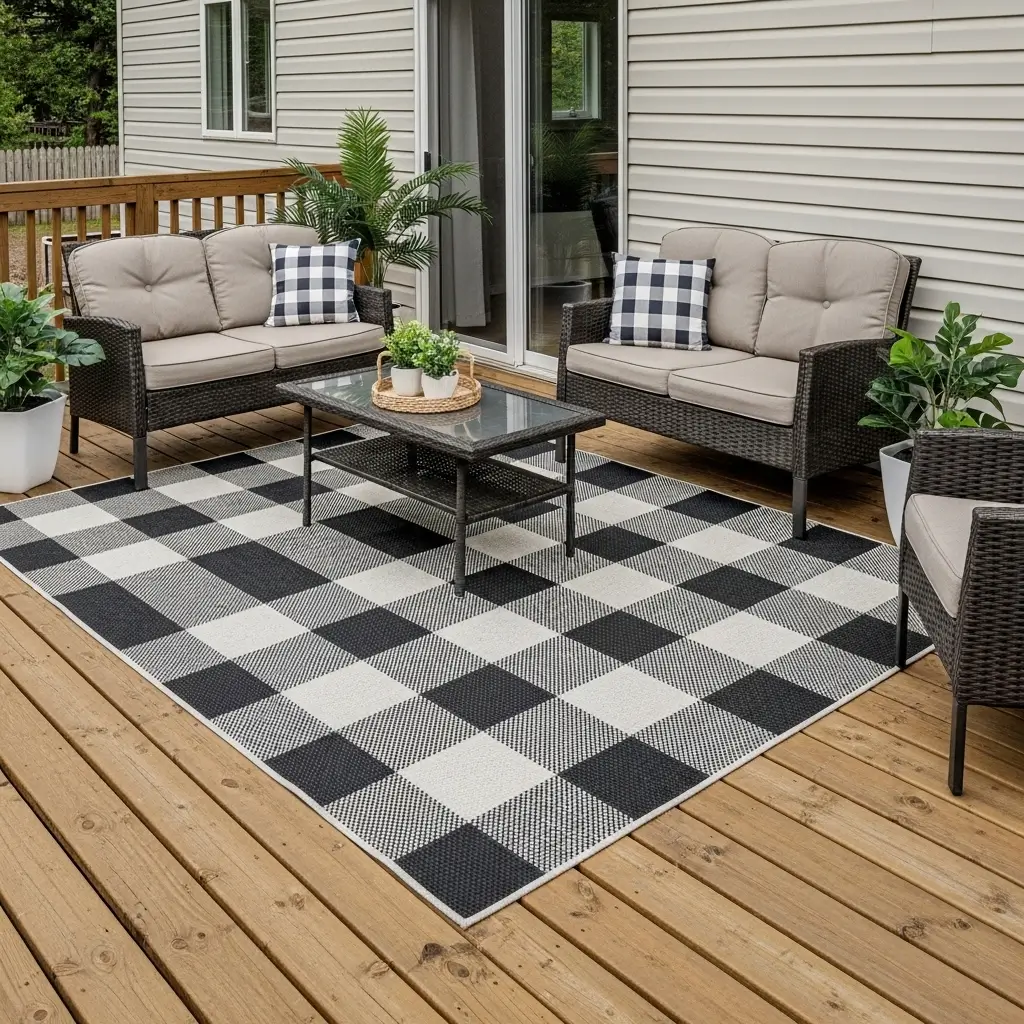 Ground your outdoor seating arrangements and effortlessly inject a splash of personality by utilizing large outdoor rugs featuring classic patterns.