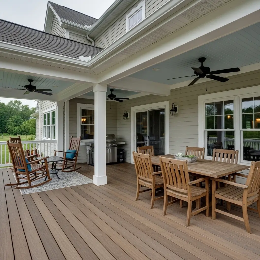 Absolutely! While natural wood is traditional, modern composite decking comes in fantastic faux-wood grain textures and matte colors that mimic the look of real wood perfectly, offering the farmhouse aesthetic without the heavy maintenance.