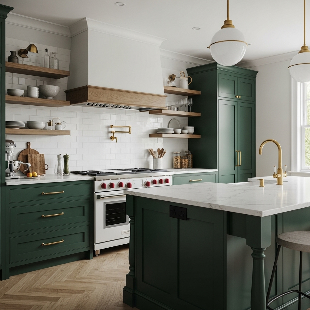 Emerald and rich jewel tones are taking center stage in modern kitchens, bringing depth, confidence, and a refined sense of drama. Emerald green, in particular, feels bold yet grounded when paired with warm wood, brass hardware, or soft neutrals.