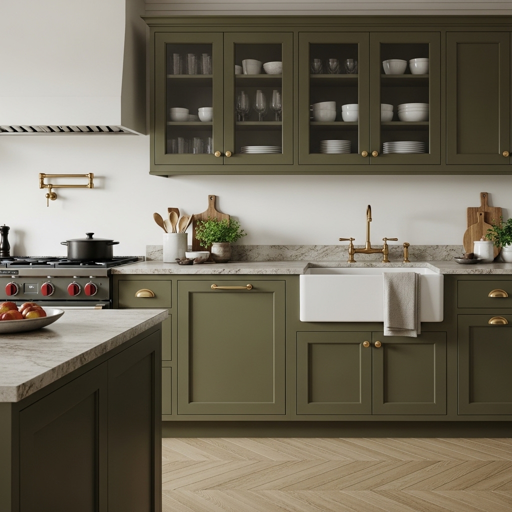 Paired with brushed brass hardware and natural stone surfaces, these greens feel organic and intentional. They work especially well in dramatic kitchens, where darker tones enhance contrast, add visual interest, and make the space feel larger through layered richness, while remaining timeless, versatile, and luxurious.