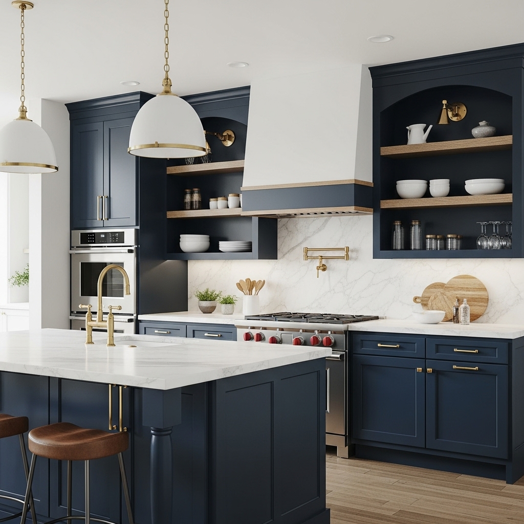 Navy blue, like Benjamin Moore’s Hale Navy, delivers sophisticated drama with gray undertones that prevent it from feeling heavy. Low light reflectance creates contrast against white walls or marble, elevating everyday kitchens.