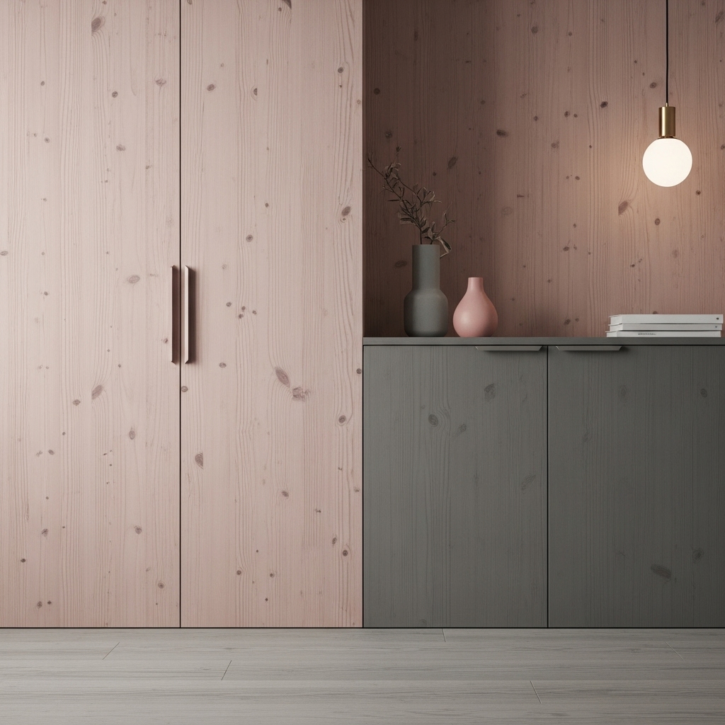 Rose pine paired with warm grays creates a refined balance between softness and strength. The muted pink undertones add warmth without overwhelming the space, while gray grounds the palette with quiet confidence.