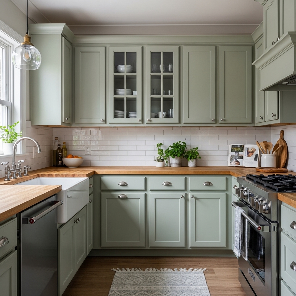 Sage green cabinets infuse kitchens with a calm, spa-like atmosphere, especially in compact spaces that need to feel open. The soft, muted tone blends effortlessly with chrome hardware, butcher-block counters, and neutral backsplashes. 76% of professionals favor sage and related greens for their natural, organic appeal.