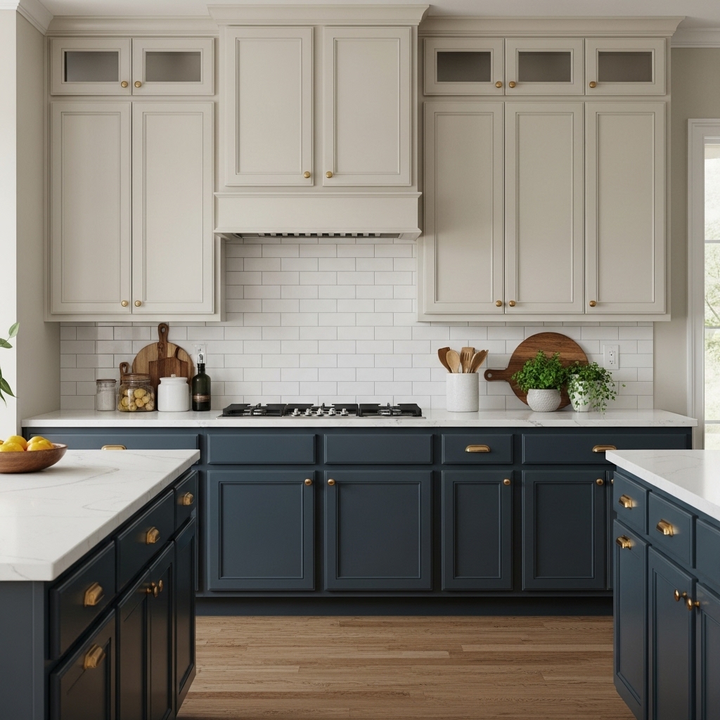 Current kitchen cabinet color trends are leaning bold yet balanced. Two-tone combinations lead the shift, pairing timeless neutrals with deep greens or moody blues. Light uppers keep kitchens open, while darker lowers ground the space with confidence.