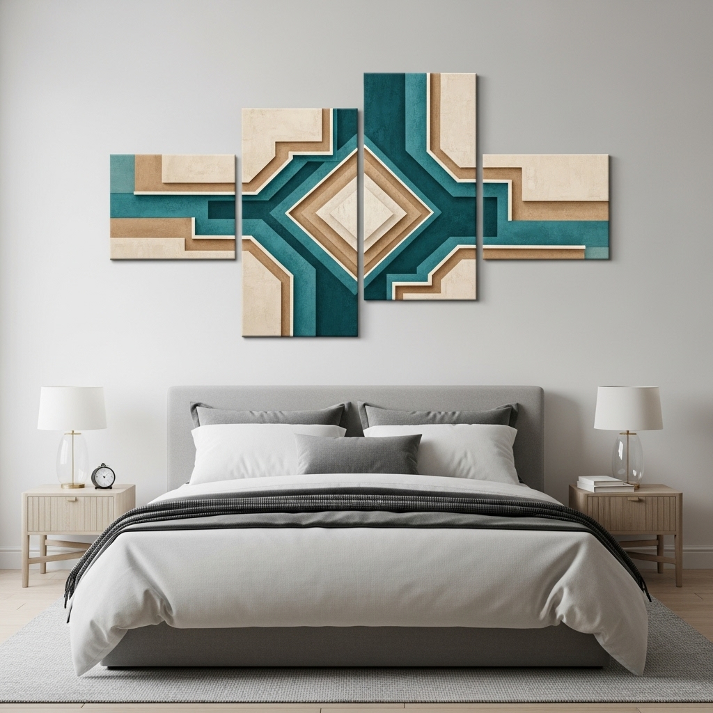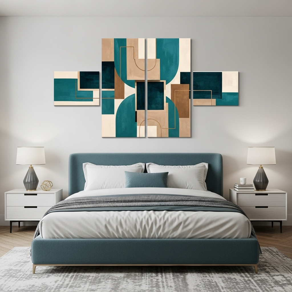 Abstract gallery sets bring an energetic pulse to any room, especially four-piece canvases in calming teal and warm beige. Pieces like Revealed by Mark Lawrence introduce bold geometric movement that instantly draws the eye and anchors the entire space.