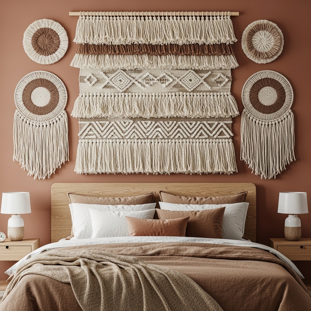 Macramé and woven wall hangings, crafted from soft, neutral fibers, add a striking layer of tactile richness to any bedroom. These hand-knotted pieces sit beautifully above headboards, giving the space a grounded, artisanal feel.