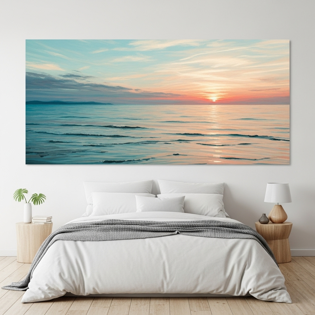 Danhui Nai’s “Sunrise” presents a sweeping horizon washed in aqua, beige, and gentle coral, creating a serene coastal-boho mood. The wide format pulls the eye outward, adding calm depth while keeping the room feeling open.