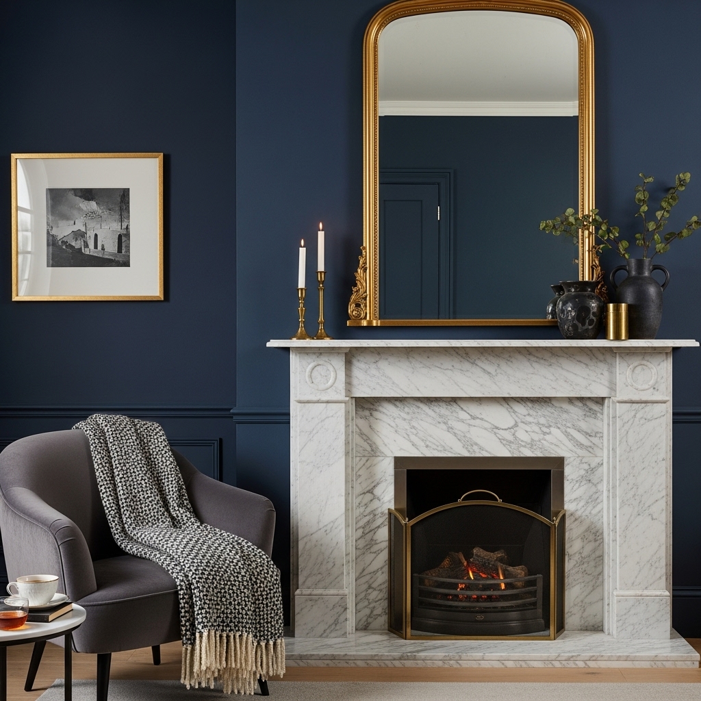 If your fireplace surround or hearth is marble or stone, highlight it with complementary colors on the walls or nearby décor. A rich blue or deep charcoal wall paint can accentuate a fireplace’s textures and make it a striking focal point.