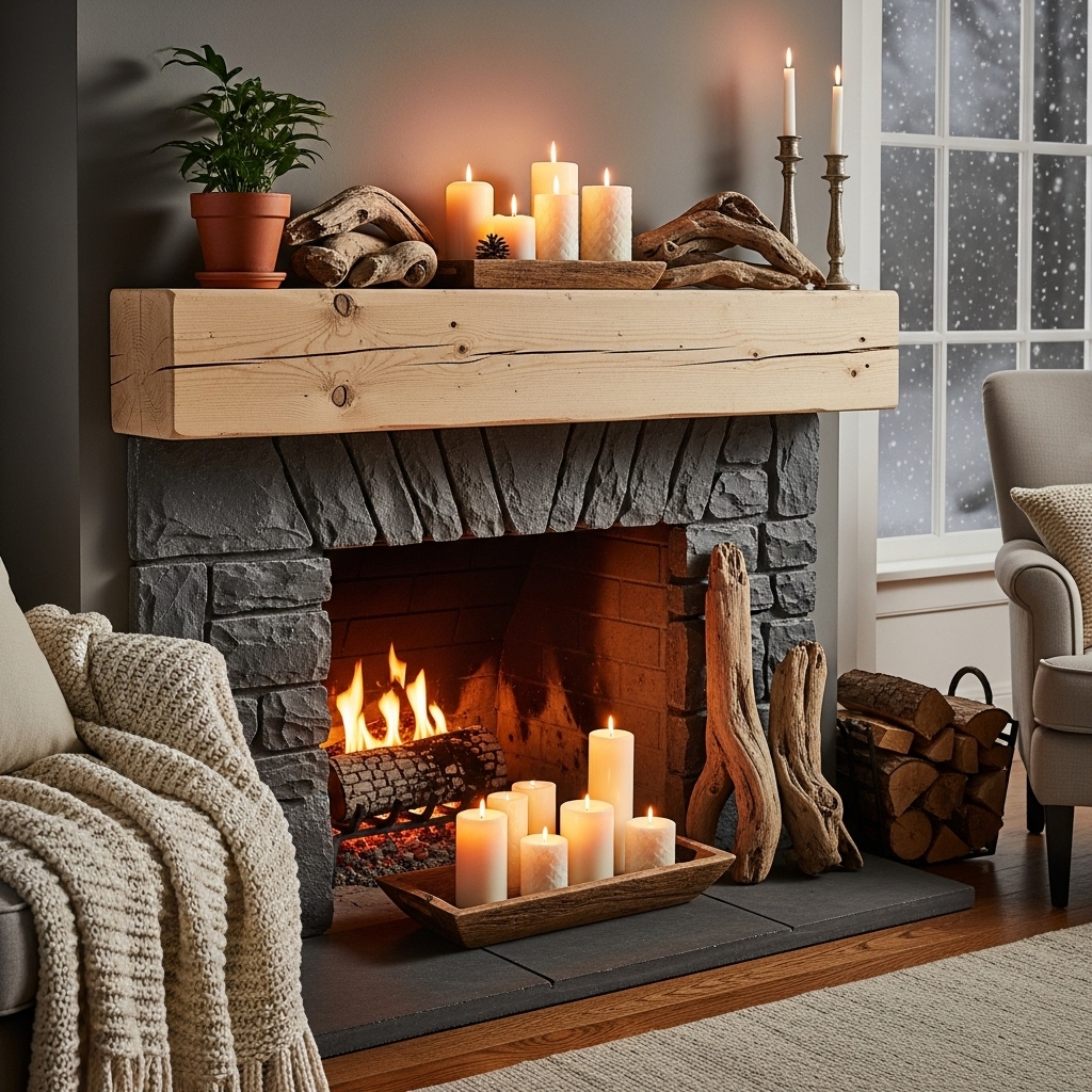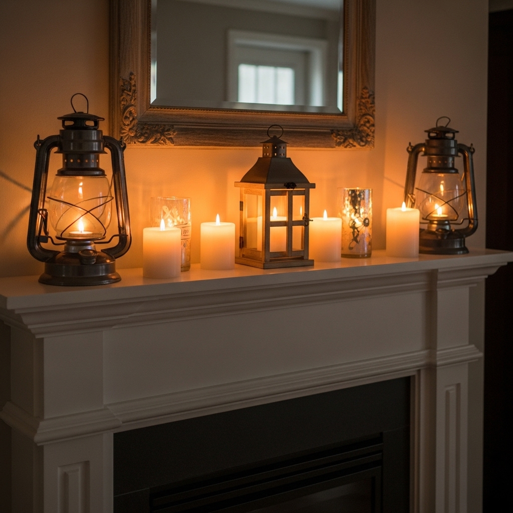 Craft a welcoming, intimate atmosphere by arranging a mix of candles and vintage-inspired lanterns along the mantel. Play with different heights and candle styles to bring depth and visual rhythm to the display.