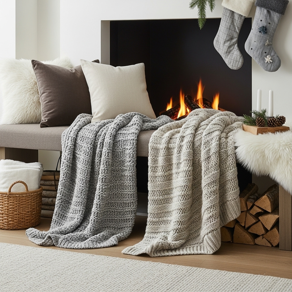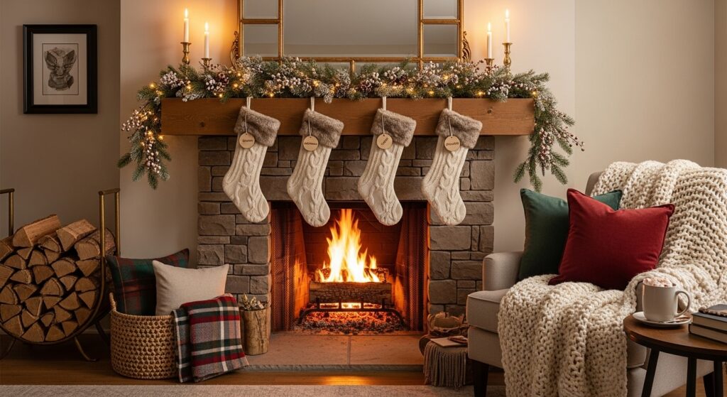 Drape cozy woolen throws or chunky knit blankets across the hearth bench, letting them cascade softly for a lived-in charm. Add plush faux fur accents that invite you to linger by the fire, and hang handmade stockings that tell stories of care and craft.