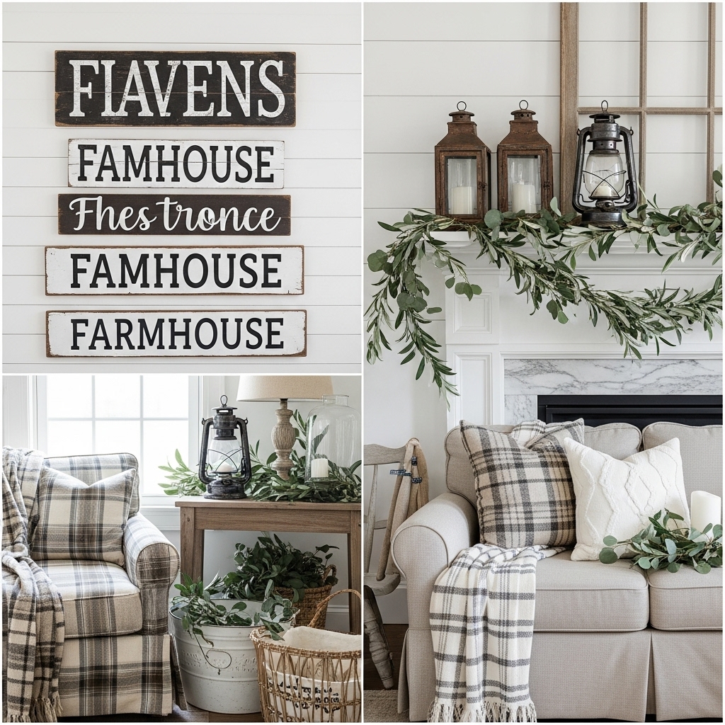 Weathered wood signs paired with soft plaid fabrics bring an inviting, homespun warmth to any space. Add vintage lanterns that cast a gentle glow, echoing memories of simpler days. Drape eucalyptus or olive branch garlands across mantels or doorways,